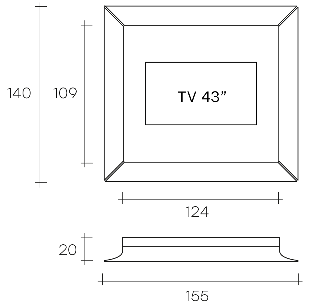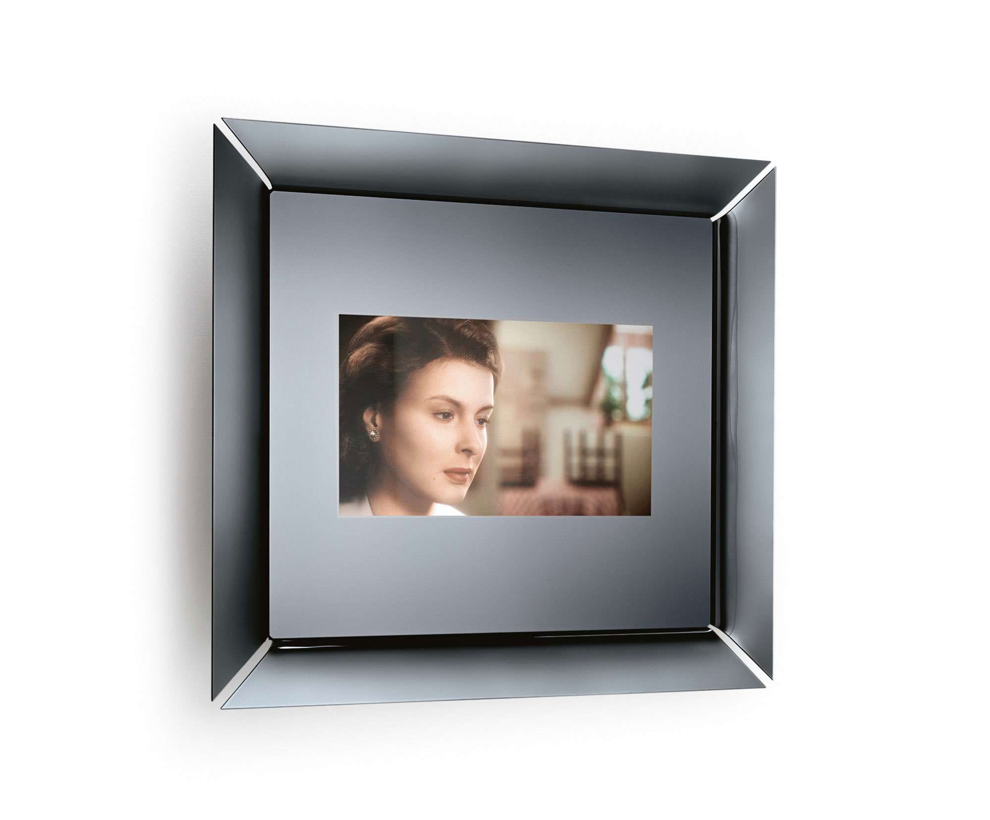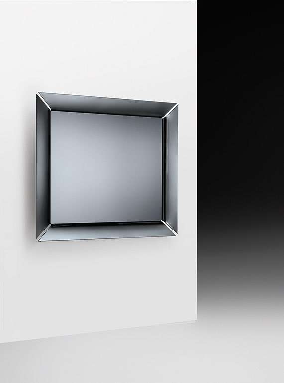 Mirror with integral television. Wall mirror in 5 mm-thick semi-reflective glass comprising 4 single curved elements in 6 mm-thick semi-reflective black back-painted glass, or in 6 mm back-silvered bronze glass. Metal frame painted matt black.