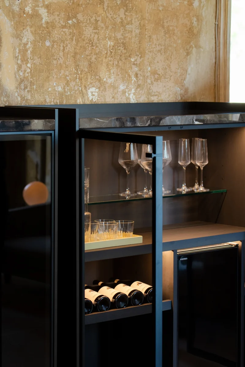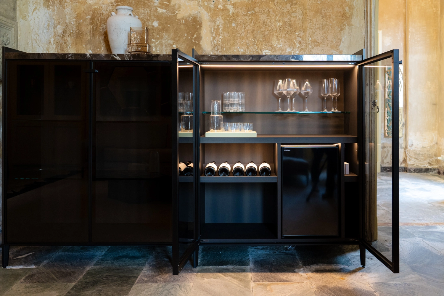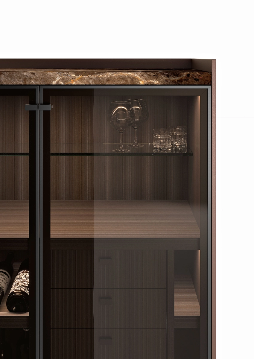 The central element of the design is the slim, minimalist frame, designed to visually lighten the structure and highlight the materials. This architectural frame gently encloses the surfaces, creating a refined interplay of suspended volumes and emphasising the contrast between the solidity of the top and the transparency of the doors.