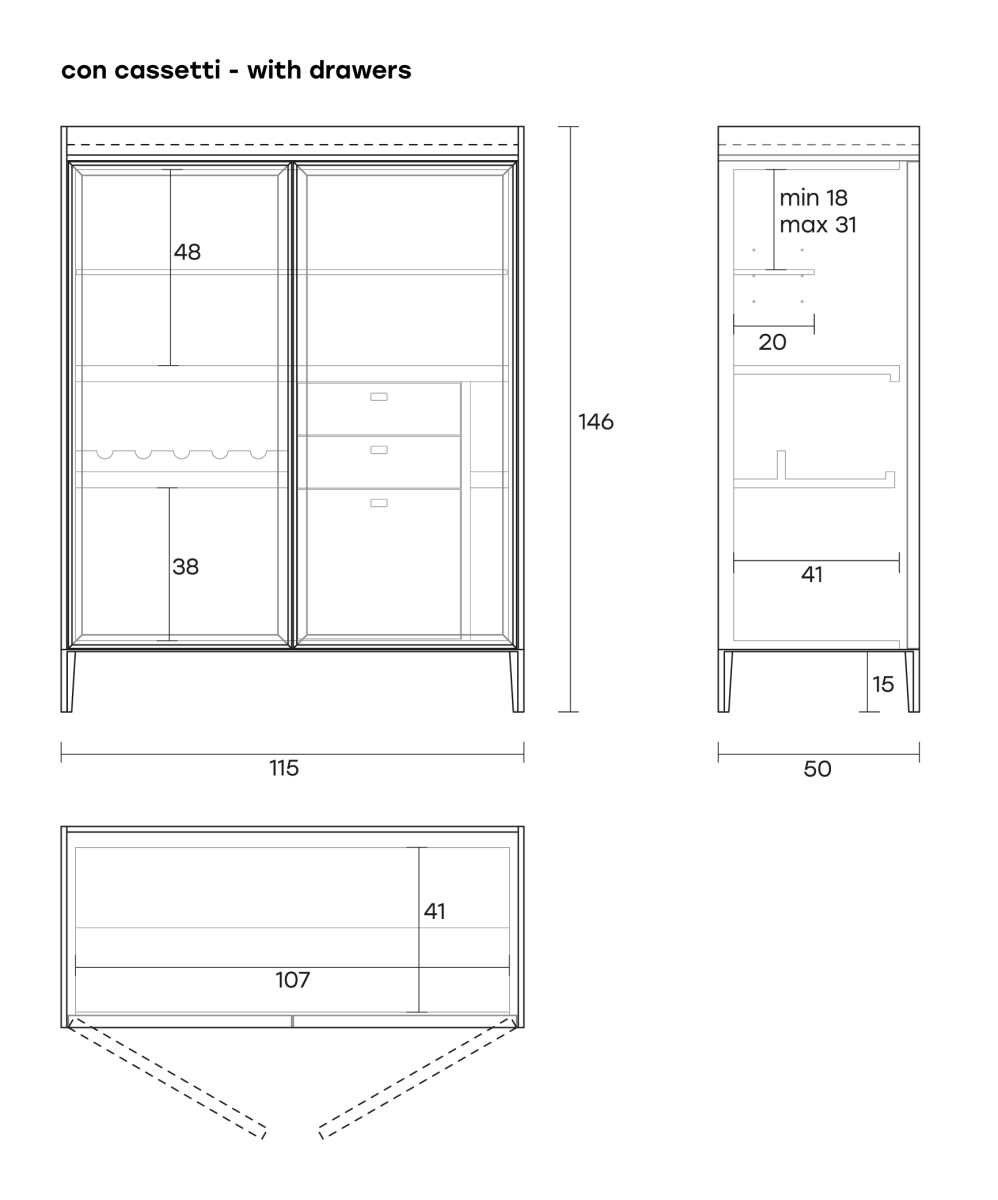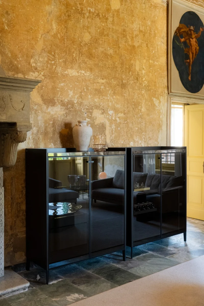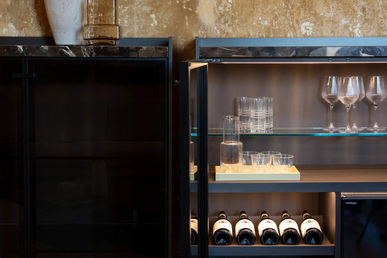 The central element of the design is the slim, minimalist frame, designed to visually lighten the structure and highlight the materials. This architectural frame gently encloses the surfaces, creating a refined interplay of suspended volumes and emphasising the contrast between the solidity of the top and the transparency of the doors.