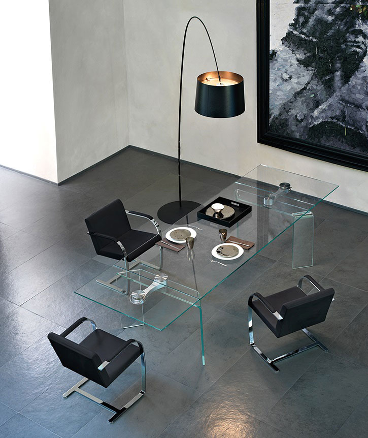 A comprehensive and high-quality collection of glass tables to stylishly furnish the dining area. Visual appeal and functionality are merged in surfaces featuring a perfectly balanced combination of transparency and curved lines that succeed in reflecting the light and illuminating the entire room.