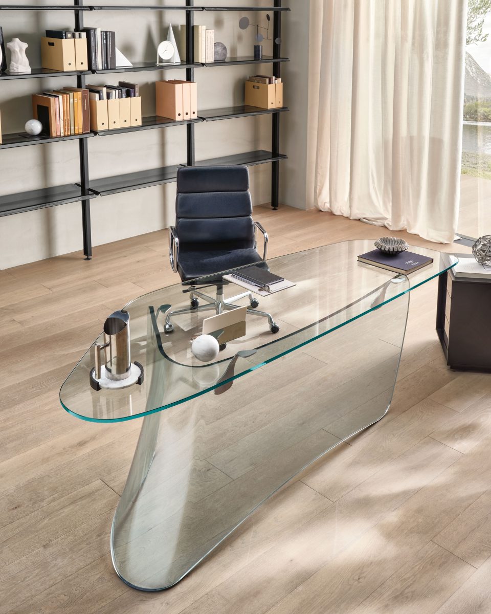 Le bureau en verre cintré s’intègre avec discrétion et élégance dans la pièce, en attribuant des connotations de télétravail à un coin du séjour, à une chambre ou à une zone fonctionnelle.