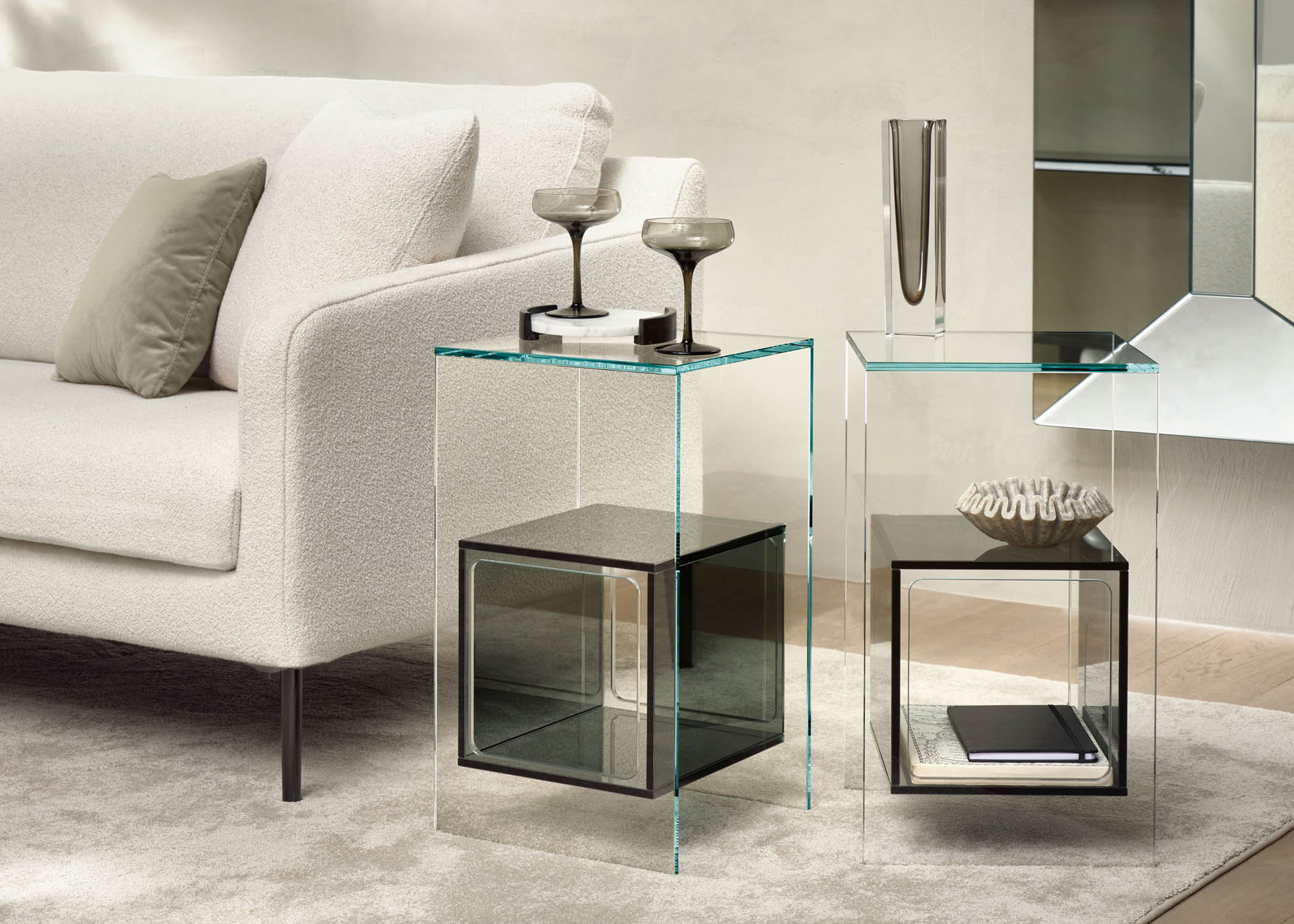 Table d’appoint avec cube-rangement en verre soudé de 10 mm. Disponible en plusieurs finitions: structure et rangement en verre transparent, structure en verre extralight, rangement en verre blanc opale; structure en verre extralight, rangement en verre fumé; structure en verre extralight, rangement en verre bronze; structure en verre extralight, rangement en verre blue; structure en verre fumé, rangement en verre Noir95.