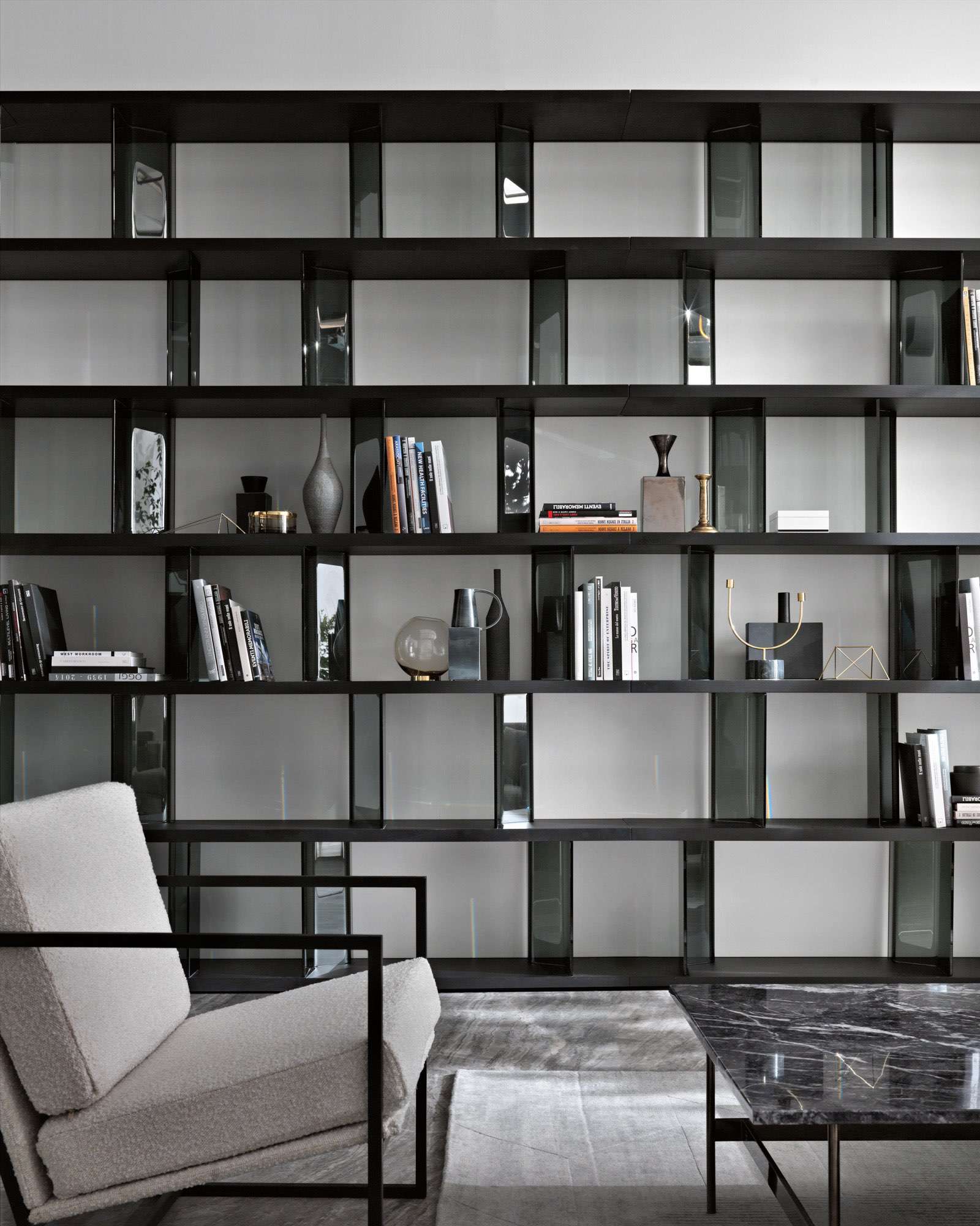 Ecco allora che la vetrina Echo viene proposta con una struttura in alluminio verniciato, finitura grigio vulcano, e ante in vetro fumé, con toni perfettamente abbinati a quelli della libreria Inori, del tavolo Agos o dei tavolini Lakes e Cannage, utilizzati in questo Mood nelle loro versioni con piano in marmo o in vetro fuso a gran fuoco retroverniciato con tinte metallizzate.